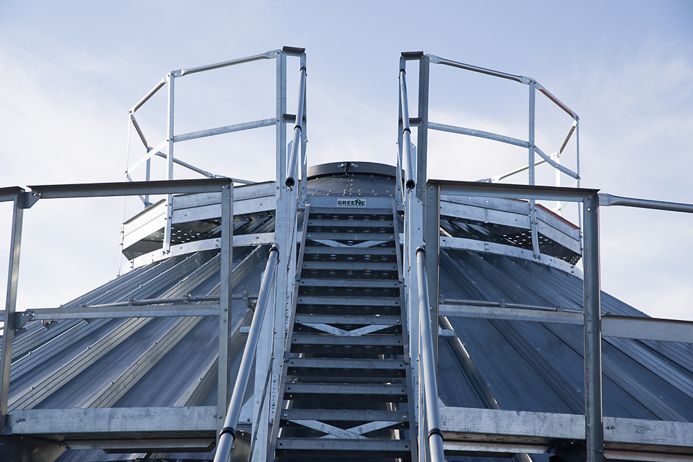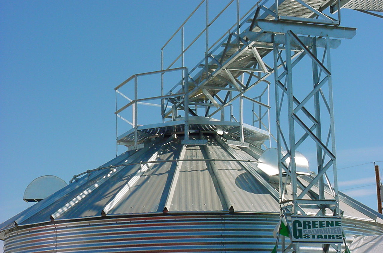 Greene Galvanized Stairs Home from nebula.wsimg.com G115 galvanized steel is standard on farm/comm bins. For over 40 years our family owned business has provided quality safety access equipment. This supplier has not provided a company introduction yet. • optional inside handrail available for increased safety and ease of climbing. Greene galvanized stairs is dedicated to providing you with accessories for grain bins and grain systems designed and manufactured with your safety needs in mind. See more ideas about silo house, grain bin house, round house. We know that keeping your employees, family and yourself safe is your number one priority. 30′ diameter grain bin, drying floor, grain spreader, fan and unload auger, greene sidewall stair system (to be removed by september 15th).